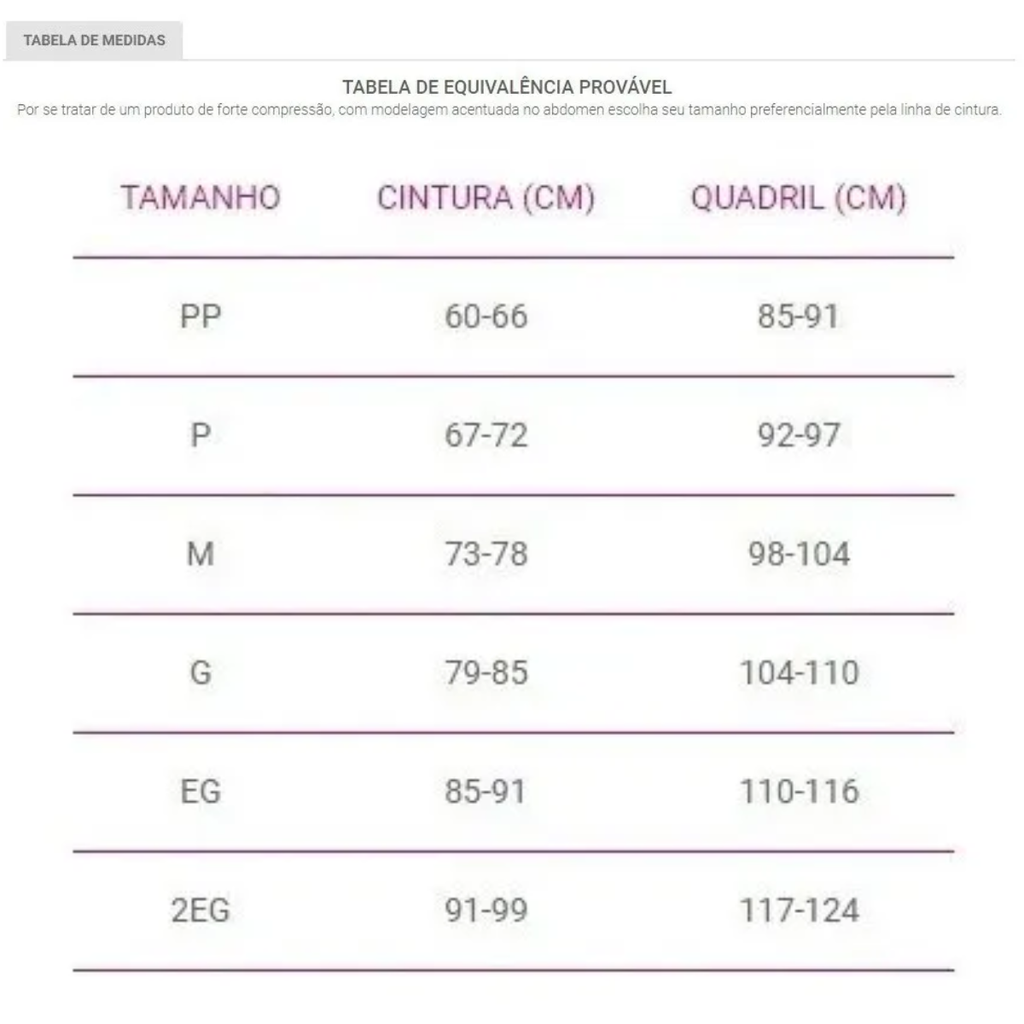 Para saber o tamanho ideal utilize a tabela abaixo usando a medida da sua cintura (4 dedos acima do umbigo)