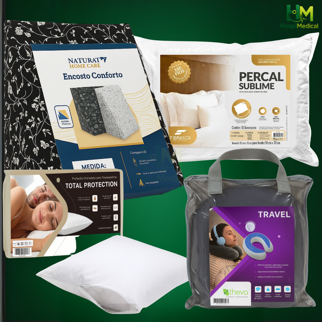 Com travesseiro Fibrasca, capa Theva, triângulo ortopédico Natural Home e almofada cervical Travel Gel, ele oferece suporte completo para cabeça, pescoço e coluna.