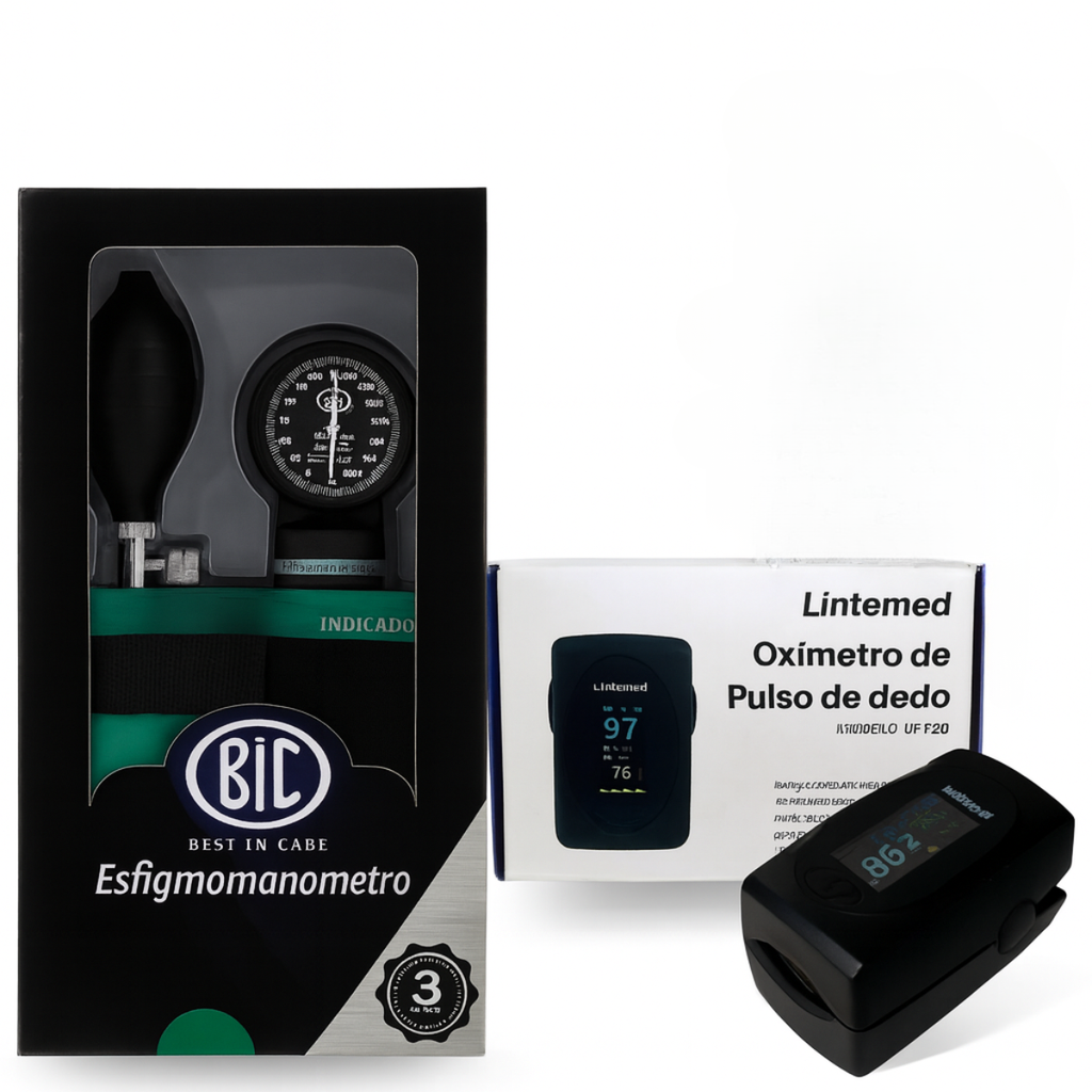 Composto por Aparelho de Pressão BIC e Oxímetro Lintmed, permite o monitoramento completo da pressão e oxigenação do sangue.