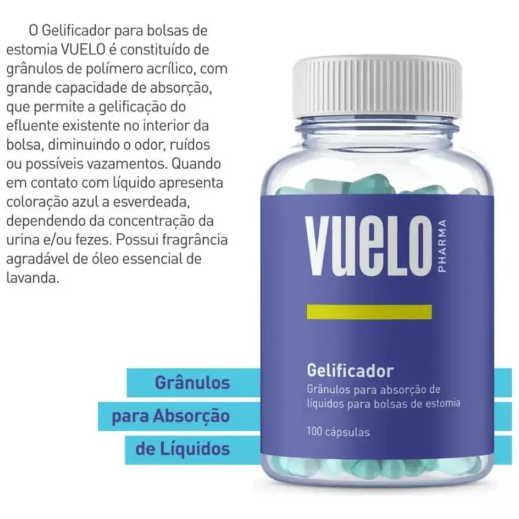 Gelificador em cápsulas indicado para absorção e solidificação de líquidos em bolsas de estomia. Auxilia no controle do conteúdo, reduz odores e facilita o manuseio da bolsa. Frasco com 100 cápsulas.