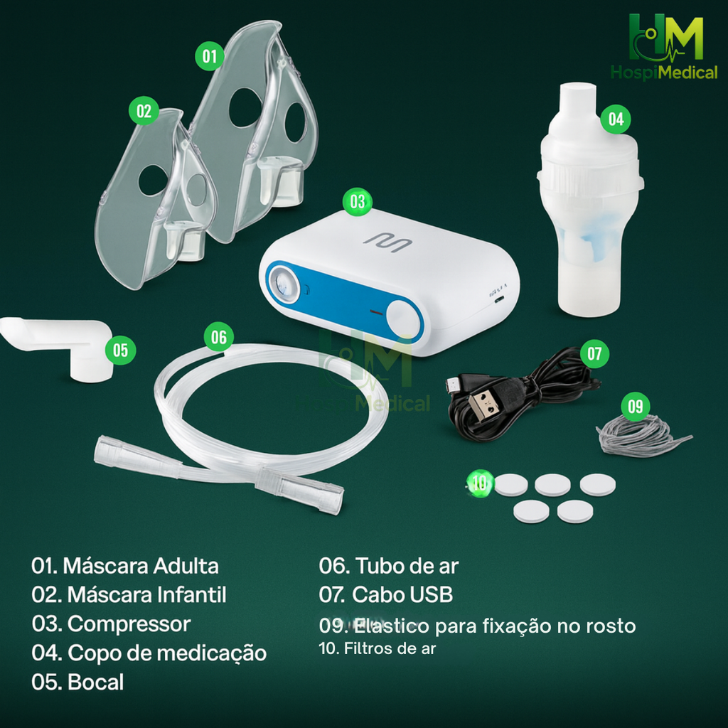 Acompanha: 2 máscaras (adulto e infantil), 1 bocal, 1elástico para fixação, 5 filtros, 1 copo para medicamento, 1 tubo conector e 1 cabo USB.