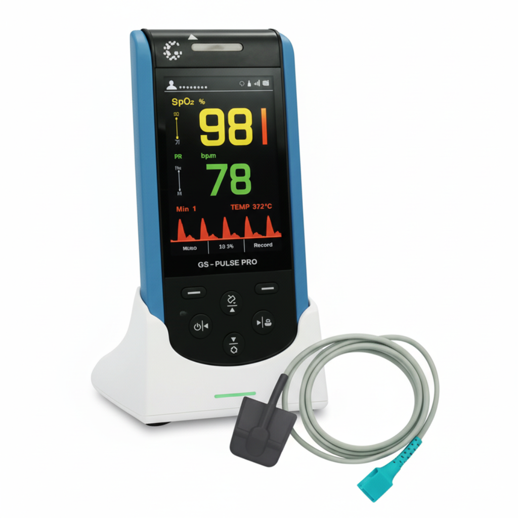 Apresentação do Produto: seguro, preciso e eficaz, o GS Pulse Pro funciona de maneira prática e intuitiva, promove monitoramento preciso, confiável e sensível mesmo com baixa perfusão, ao movimento e com sinais de pulso fraco. Possui autonomia de bateria de até 18 horas e o suporte (base carregadora) facilita o deslocamento e manuseio do dispositivo, conferindo estabilidade em qualquer superfície plana e melhor visualização dos dados.